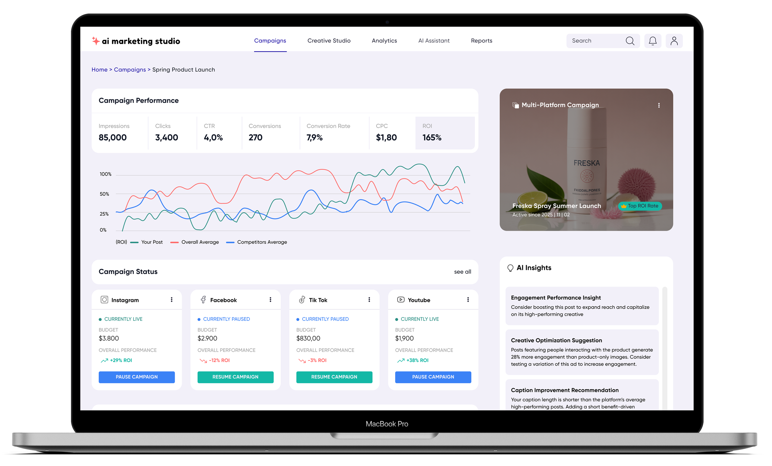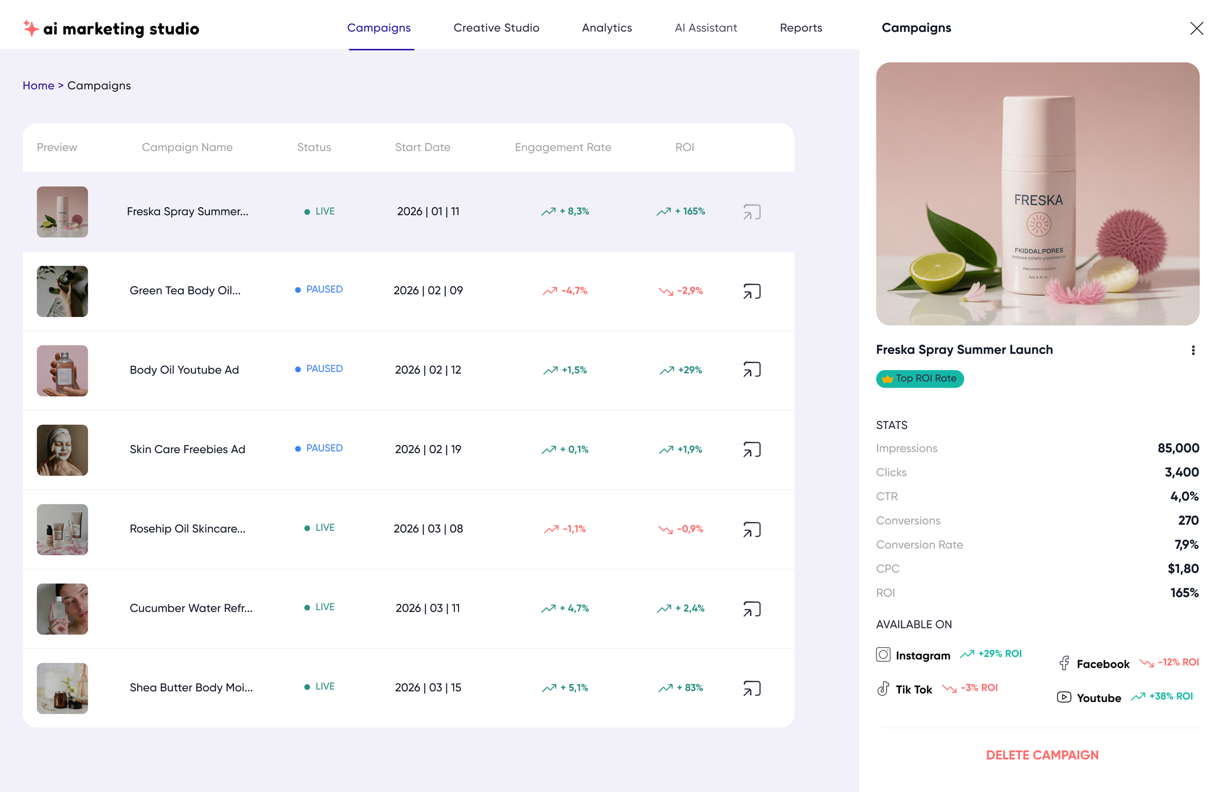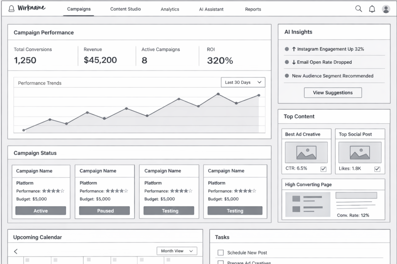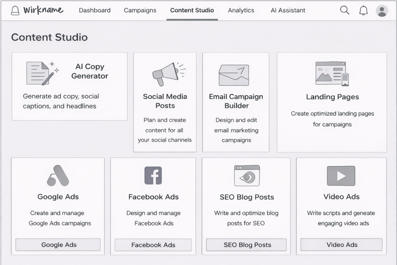 AI Marketing Studio centralizes marketing operations into a single intelligent workspace. By combining campaign analytics, AI-driven insights, and content generation tools, the platform enables marketers to move seamlessly from data analysis to campaign execution.
