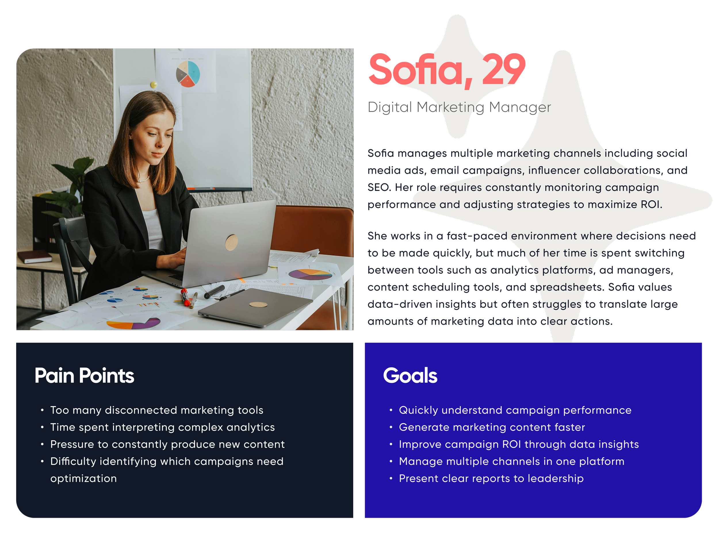 The goal of the UX research phase was to understand how marketing professionals manage campaigns across multiple platforms and identify opportunities where AI assistance could simplify their workflow.