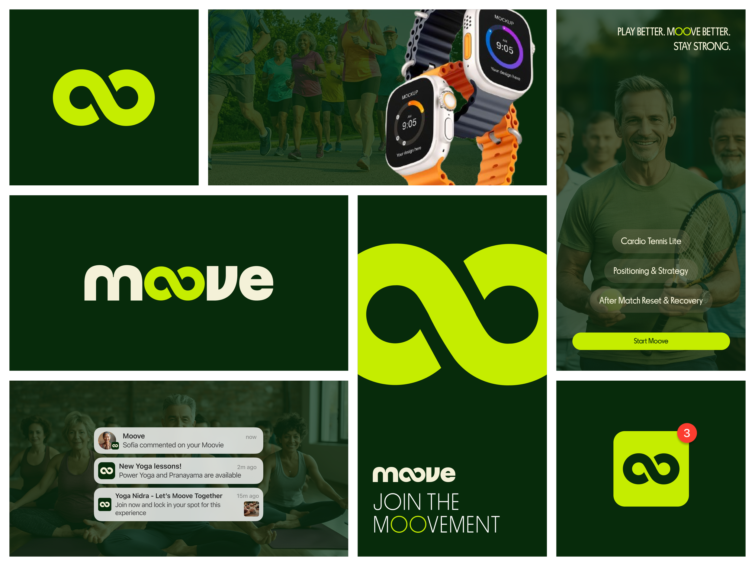 OVERVIEWMoove is a fitness and community platform designed specifically for adults 50+, helping them rediscover movement in a way that feels simple, social, and genuinely enjoyable. Instead of focusing on performance, numbers, or intensity, the project reframes fitness as a lifelong journey rooted in consistency, connection and well-being. The brand strategy centers on building healthy habits through everyday activities and shared experiences, encouraging users to stay active not by pushing limits, but by showing up — together.