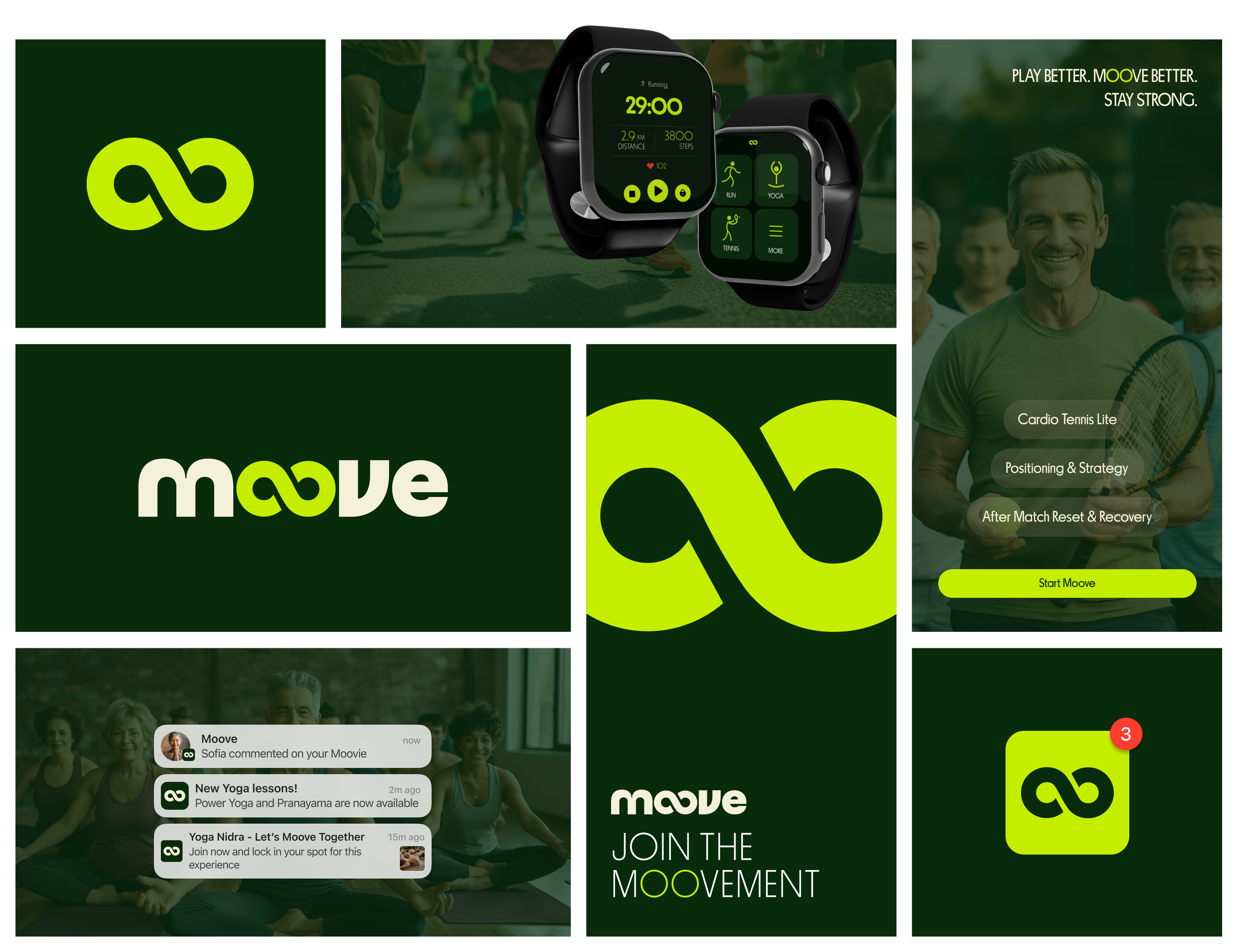 OVERVIEWMoove is a fitness and community platform designed specifically for adults 50+, helping them rediscover movement in a way that feels simple, social, and genuinely enjoyable. Instead of focusing on performance, numbers, or intensity, the project reframes fitness as a lifelong journey rooted in consistency, connection and well-being. The brand strategy centers on building healthy habits through everyday activities and shared experiences, encouraging users to stay active not by pushing limits, but by showing up — together.