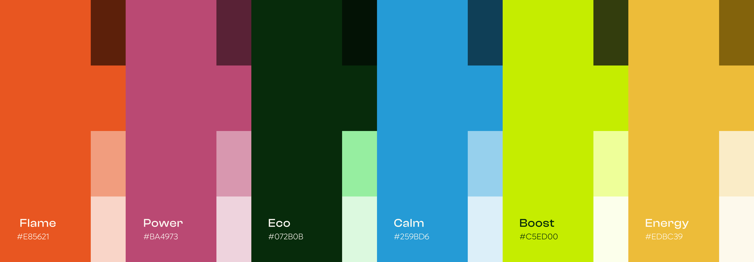 Moove’s color palette was designed to capture the vitality, optimism, and spark of movement. The brand uses bold, vivid tones that reflect both physical energy and emotional warmth — the kind of feeling you get after a good stretch, a long walk, or a shared laugh with friends.