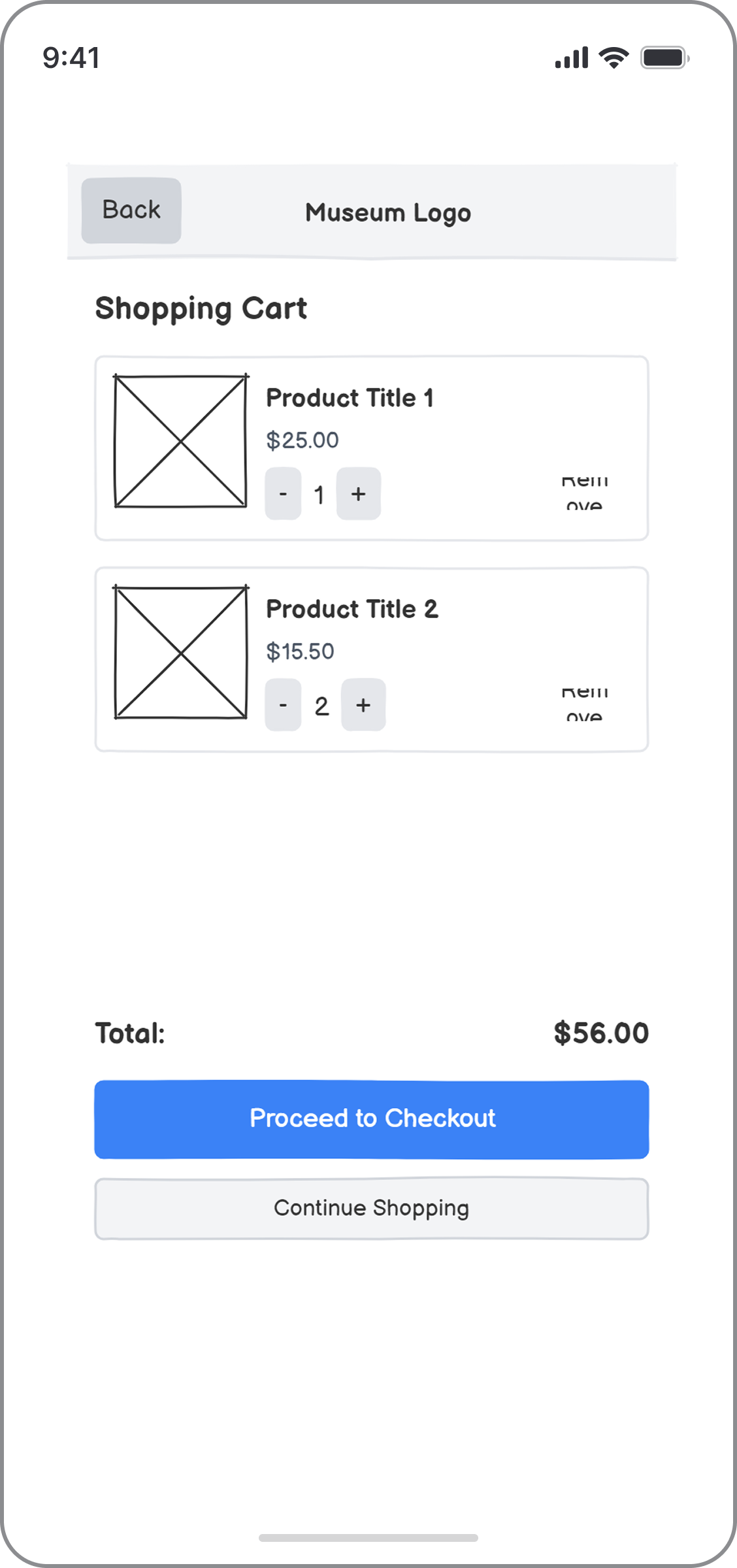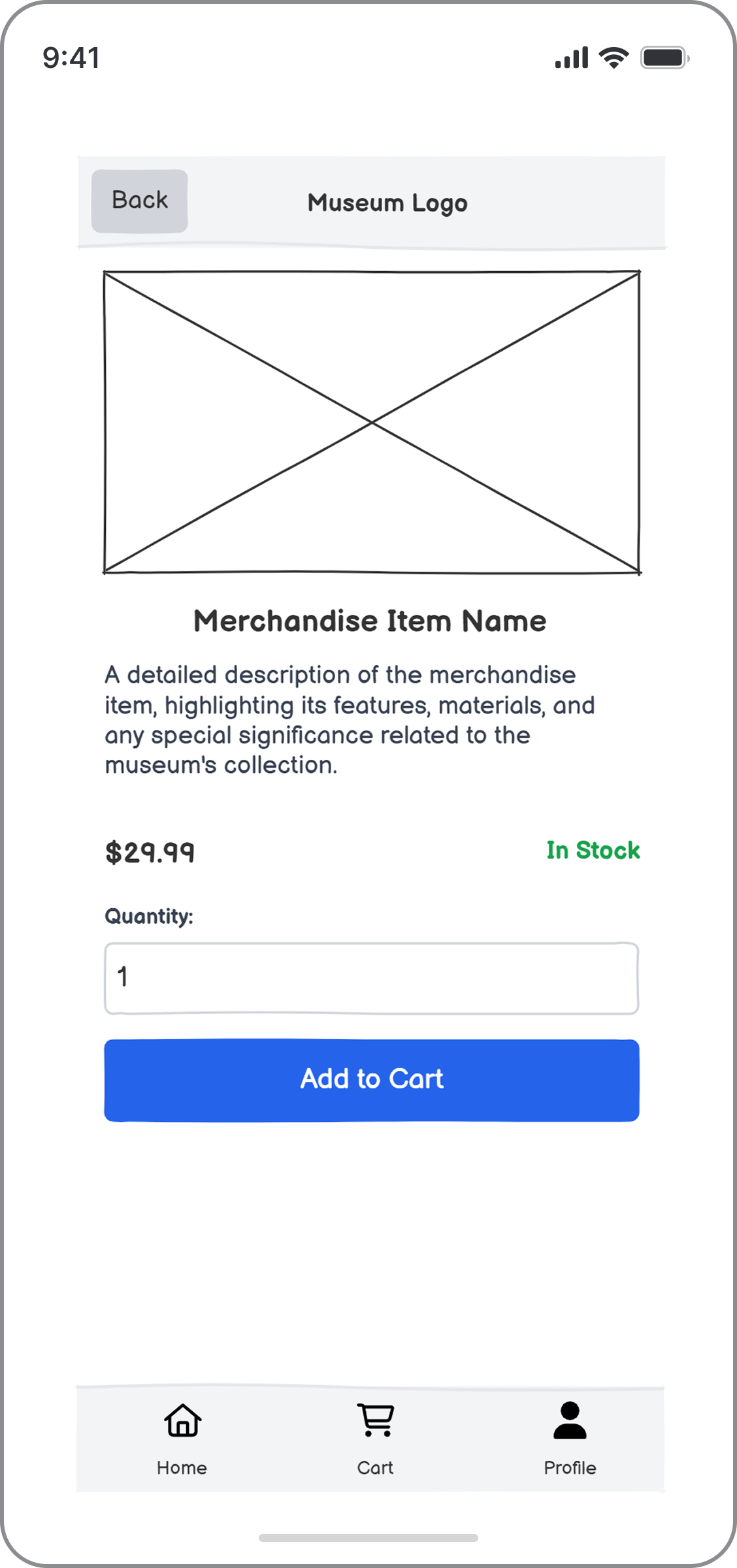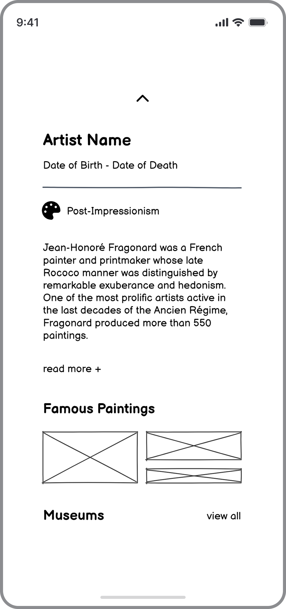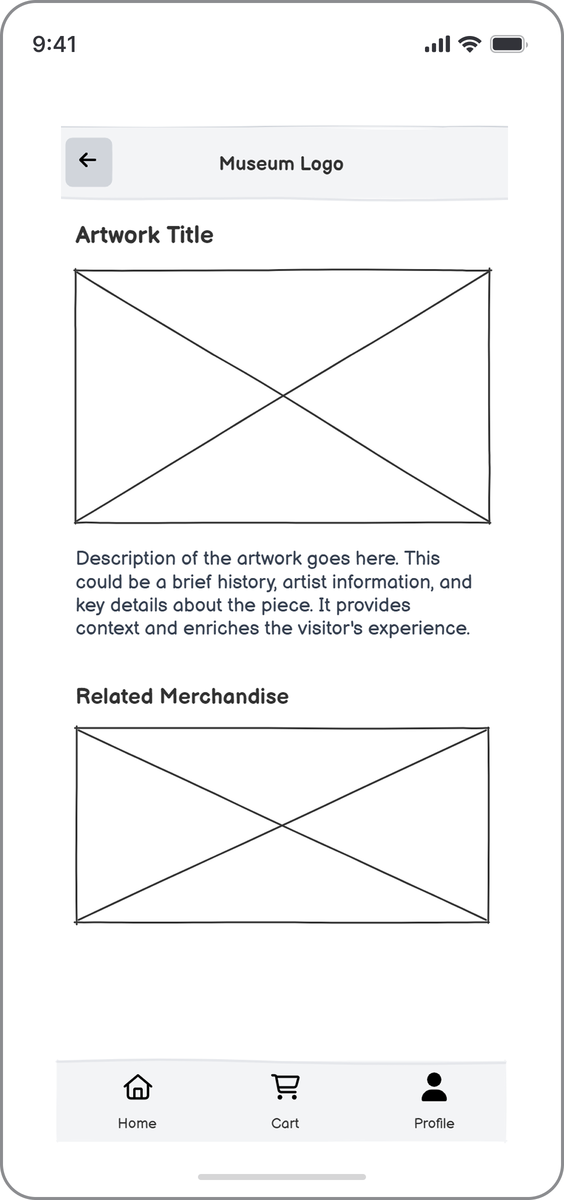 Balsamiq’s built-in AI feature also helped accelerate the process. Using a few targeted prompts, I generated early wireframe concepts for a mobile app designed for art enthusiasts. The app allows users to explore detailed information about artists, discover related merchandise available in the museum store, and browse dedicated product pages.
