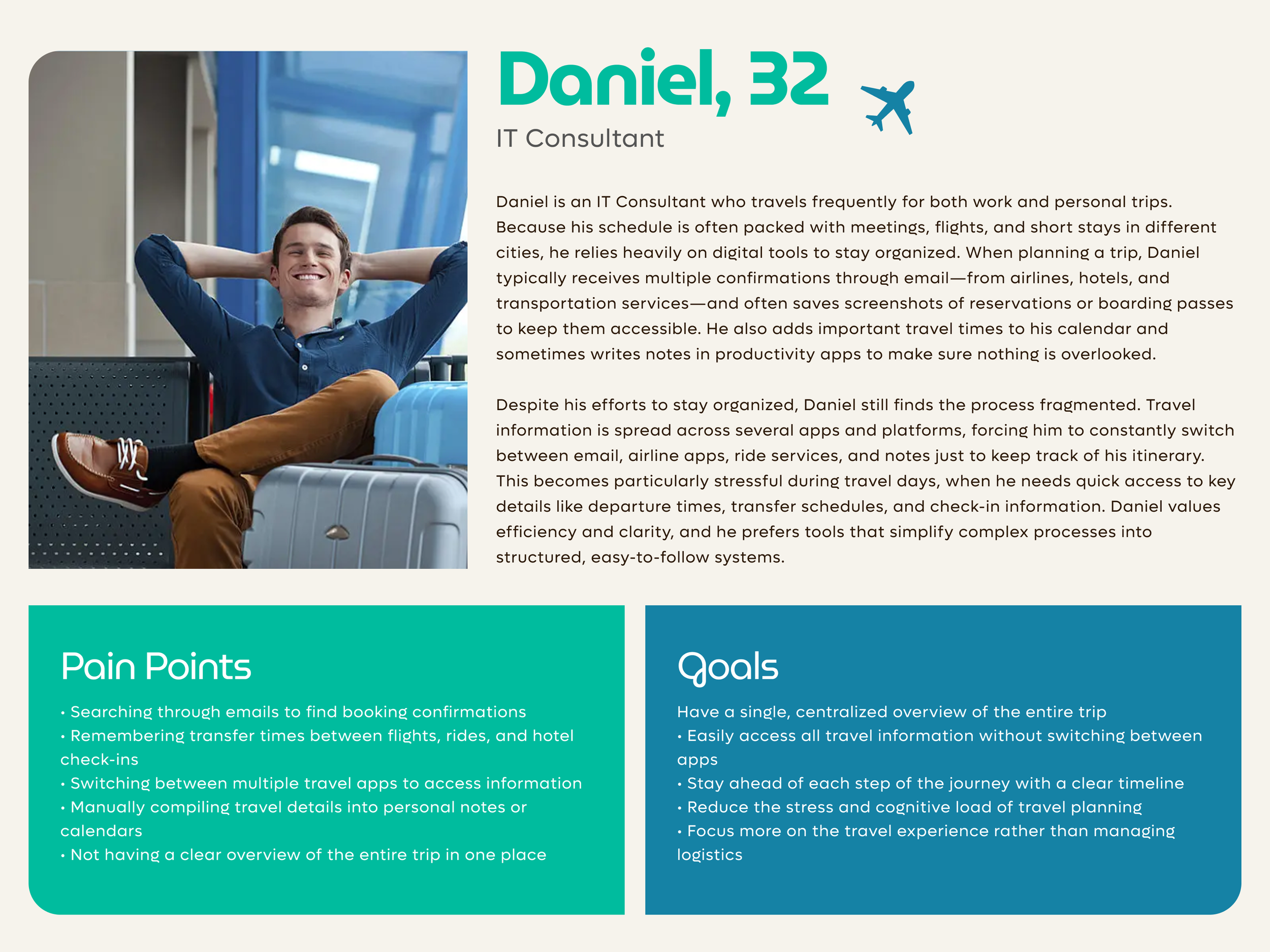 The primary audience for this product is organized travelers—people who value structured planning and clear schedules when preparing for a trip. These users often approach travel with the same mindset they apply to their daily productivity: keeping track of details, planning ahead, and maintaining a clear overview of their schedule. Having all travel information in one place helps them feel more in control and reduces the stress that can come with managing multiple reservations and confirmations.